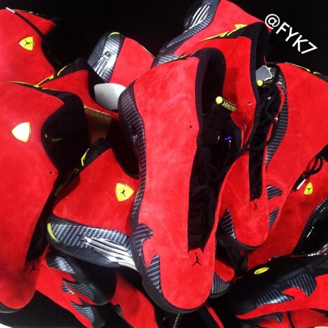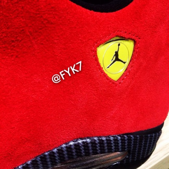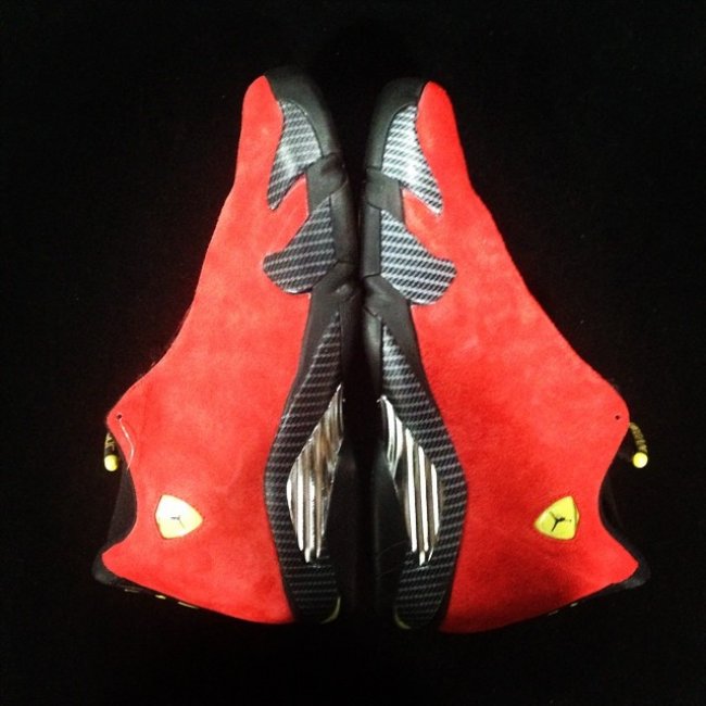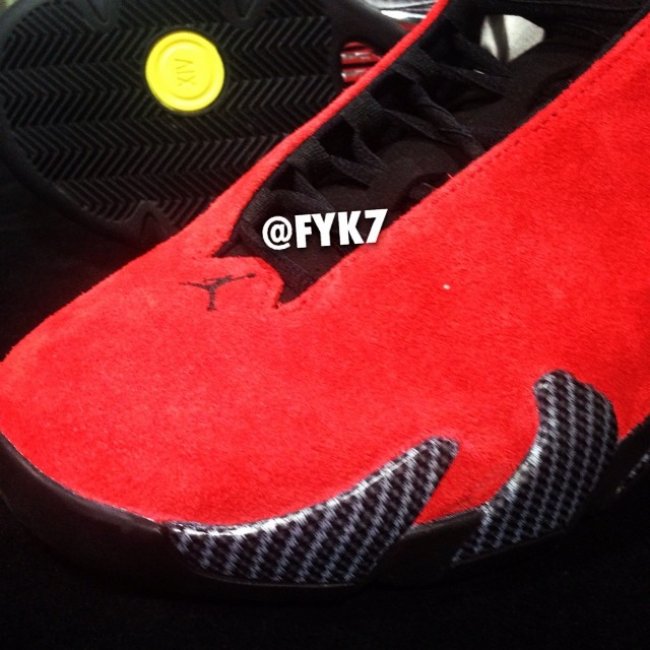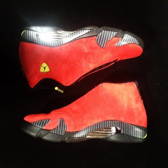 采用大面积红色麂皮打造的Air Jordan 14 全新红麂皮版本,现已确定将于今年上市,货号:654459-670,售价预计为:1649RMB。Air Jordan 14 设计灵感来自于乔帮主最喜欢的法拉利跑车,红色的鞋面加上黄色的盾牌细节,令鞋款整体如同一辆闪亮的红色法拉利一般动人。