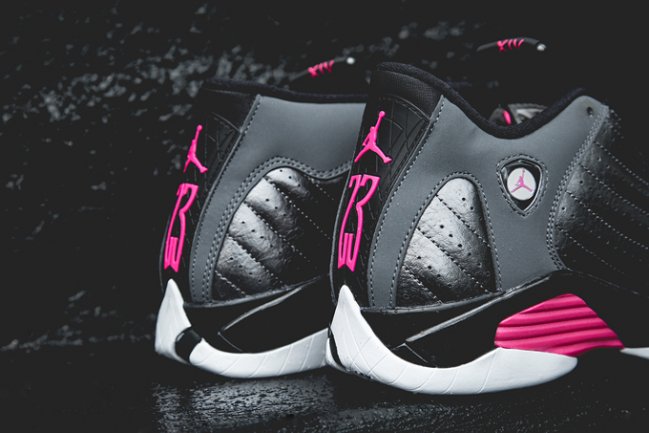 继上周末的“雷公”配色之后,Jordan Brand 在整个下半年将陆续为我们带来多款 Air Jordan 14 的复刻作品,紧接着将要登场的是一款女码的 Air Jordan 14 Retro 黑/灰/粉配色。鞋款以黑灰色为主基调,再于细节位置注入可爱的桃粉色加以点缀。鞋款将于近期正式发售,各位AJGirl喜欢的话可要做好准备了。