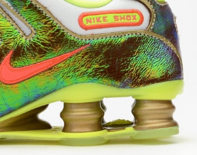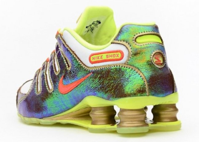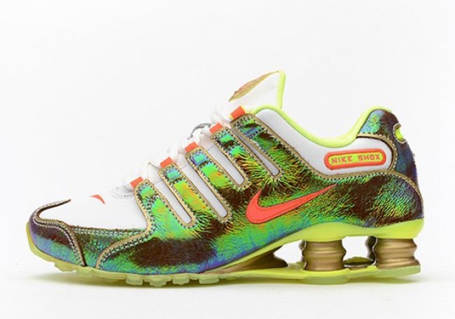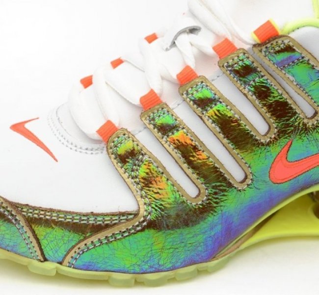 Nike推出全新Trophy系列产品,其中便包含了眼前这款为女生们专门打造的Shox NZ。鞋身选用带有彩虹色渐变反光效果的漆皮物料制作,搭配白色以及荧光色细节,此款货号677394-700,现已发售。