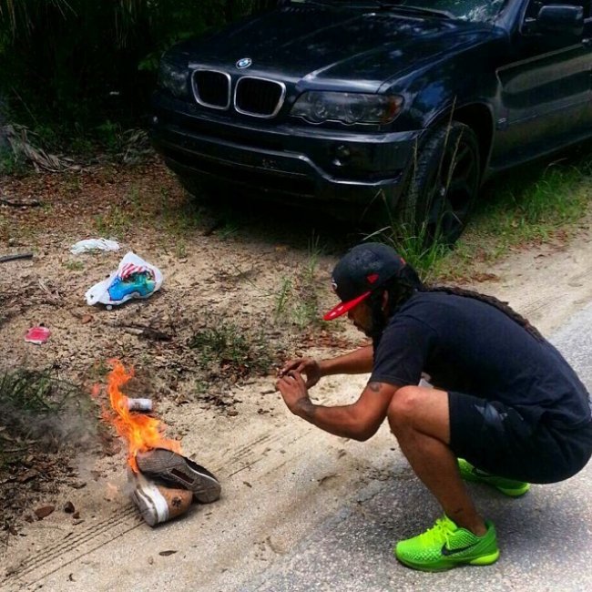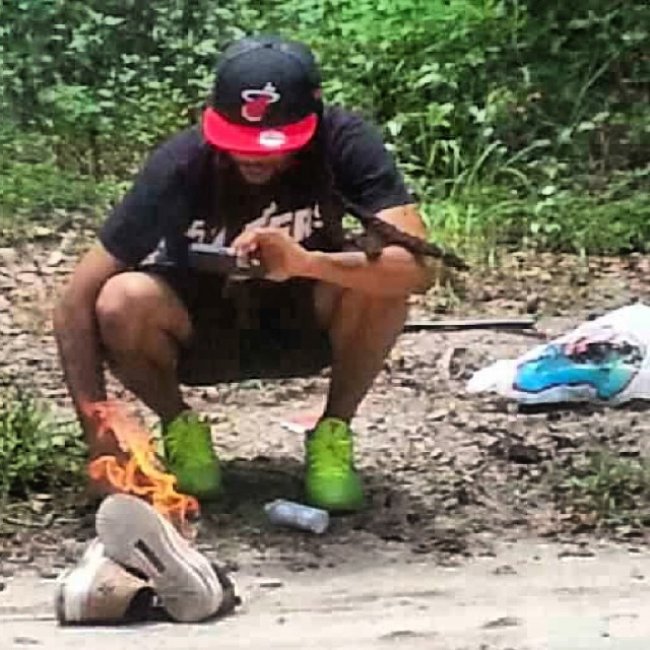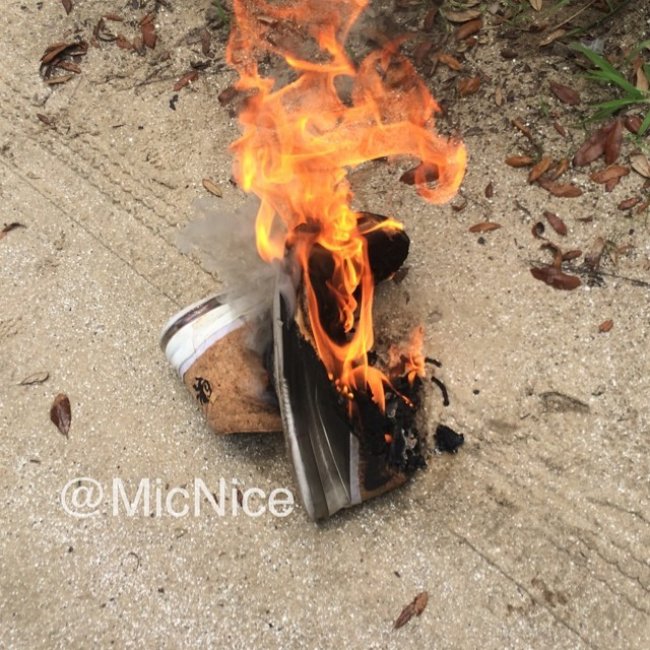 北京时间7月12日,LeBron James通过著名的《体育画报》发表了自己决定重返克里夫兰骑士队的决定后,引发了部分迈阿密热火队球迷的不理智行为。其中就有一位名叫 Mic Nice 的黑人小伙,将自己收藏的Nike LeBron X”Cork" 付之一炬。软木塞材质的球鞋被点燃之后,很快就被烧毁,让人颇为惋惜。PS:如此宣泄的方法,小编并不提倡哦!