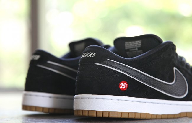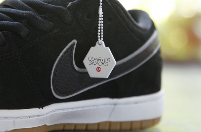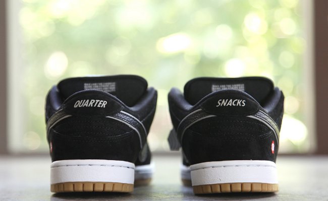 纽约滑板杂志Quartersnacks联手Nike SB呈上全新联名SB Dunk Low。鞋款选用低调的黑色搭配反光银色细节、白色中底以及生胶大底,麂皮鞋身搭配鞋舌防撕尼龙,鞋款鞋舌、鞋垫以及鞋侧刺绣均有25¢标志,后跟则分别绣着Quarter以及Snacks字样。此款联名作品即将于今年夏季正式发售。