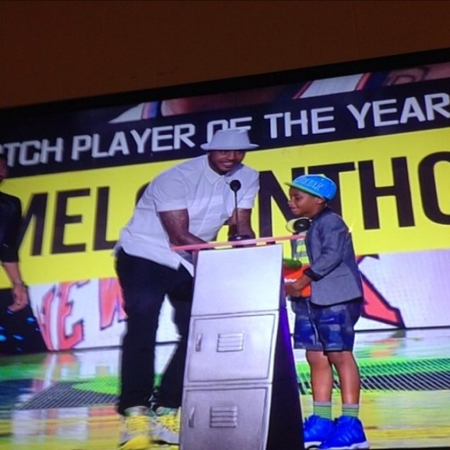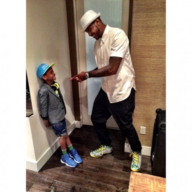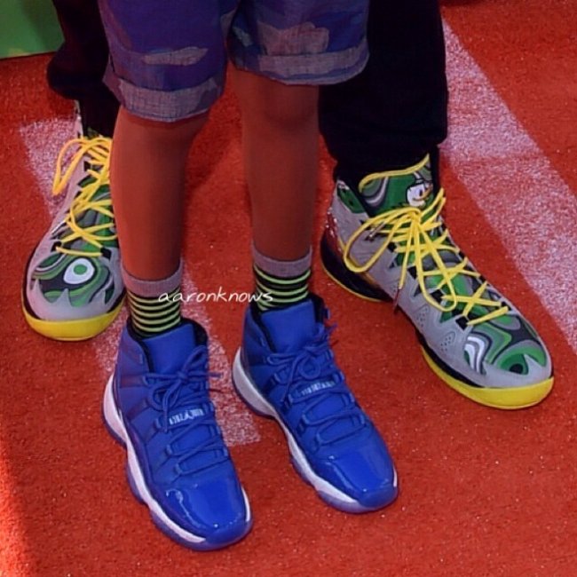“甜瓜”Carmelo Anthony携儿子Kiyan Anthony一同前往2014年KCA美国儿童选择奖出任颁奖嘉宾,身为Jordan Brand成员的父子二人都上脚了十分稀有的球鞋:Carmelo Anthony穿着的是一双专属于俄勒冈鸭队球员的Jordan Melo M10 俄勒冈鸭队PE;而Kiyan Anthony脚上的Air Jordan 11 则更狠了!为Michael Jordan赠予其的全球唯一一双的Air Jordan 11 Kiyan Anthony PE。皇家蓝鞋身搭配黑色内衬,水晶大底辅以白色中底,极为抢眼。(图片来源网络)