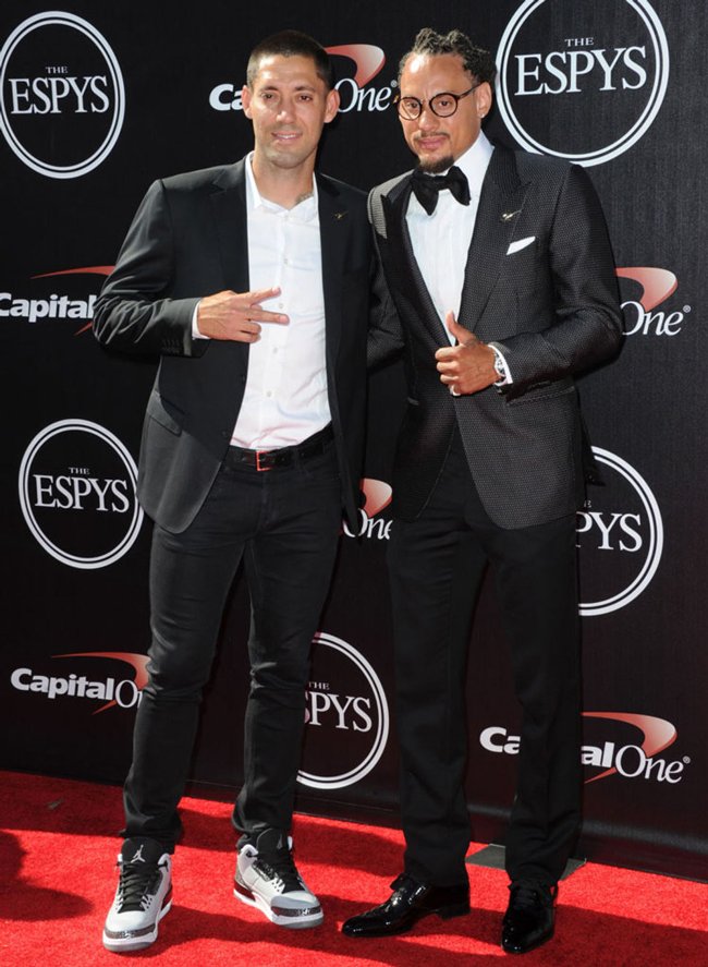 美国男足的中场球员克林特 邓普西在前不久的巴西世界杯上大放异彩,在对阵加纳的比赛中完成了一记开场30秒闪电进球。前两天邓普西也是参加了在洛杉矶举行的 ESPYS 体育颁奖礼。而一身正装出席的邓普西却意外地选择了一双上周刚刚发售的 Air Jordan 3 “Wolf Grey” 作为搭配,看来这股AJ热已经蔓延到了足球场上,小编个人觉得邓普西这一套搭配还真不会显得很突兀,大家觉得呢?