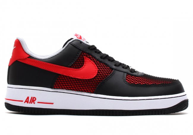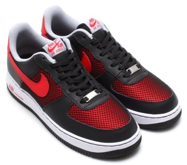 继白/蓝配色版本上架后,整体风格犹如Air Jordan 4的Nike Air Force 1 Low再现新配色,鞋身黑色搭配红色,配以白色内衬以及中底,鞋面以及鞋侧依旧附有塑料网面装饰。此款现已上架。