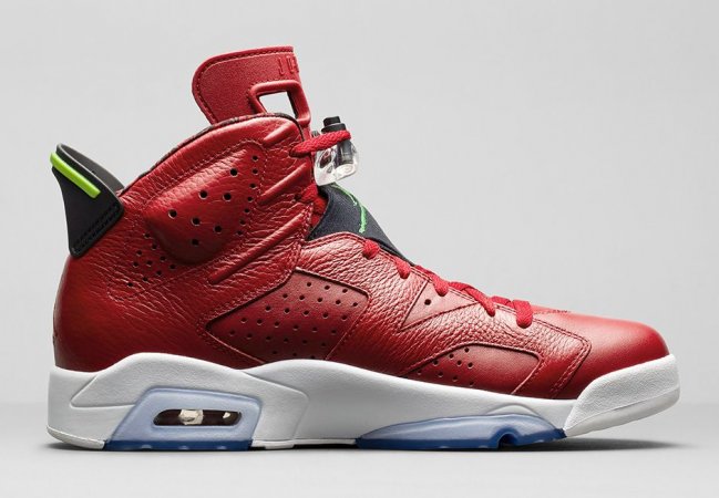 此款火红鞋身的 Air Jordan 6 “Spizike” 专为纪念斯派克李的电影《Do the Right Thing》25 周年所打造。红色皮质鞋面搭配白色中底和蓝水晶大底,整体效果十分抢眼。细节采用绿色点缀,红色内衬上的黑色图纹呈现了主题相关的内容,颇为特别。