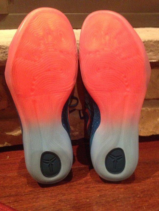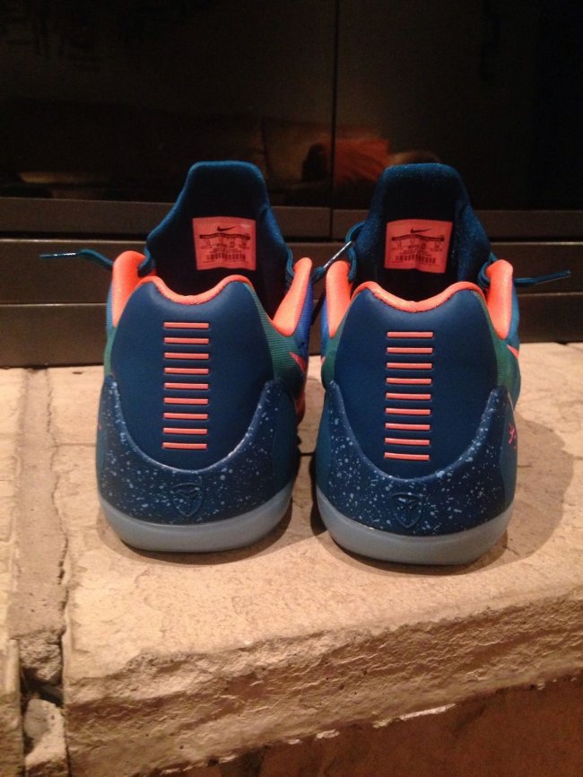 Kobe 9 EM EYBL “Peach Jam” 采用了蓝色工程网面鞋面辅以独特的绿色渐变效果,并搭配桃色内衬、Swoosh等细节。水晶大底内采用前桃色后蓝色的渐变呈现,令鞋款拥有不俗的视觉外观。这双Nike Kobe 9 EM “Peach Jam”据悉只为球员提供,应该没有市售的可能。