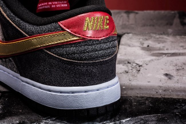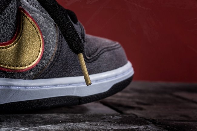 NIKE DUNK LOW PREMIUM SB QS鞋面运用了北京特有四合院建筑的砖灰色为主色调。鞋身两侧使用仿古皮革来模仿古老且历经日晒雨淋的墙砖,它们是胡同的主要建筑材料。而仿古皮革本身的特性使得每只鞋都呈现出独一无二的皮革纹理。 北京胡同中遍布的传统元素,例如金色的门扣、火红的灯笼和“囍”字,都成为了设计灵感来源:SWOOSH标识和鞋跟处的金色与红色勾边、鞋舌上的铜狮子图案、金属鞋带头、以及鞋垫上的“胡同”字样,都寓意着传统文化中的好运快乐和喜庆祥和。