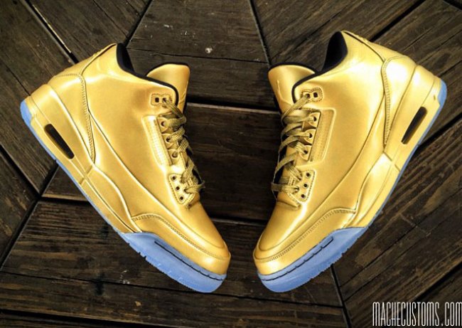 Usher和Drake都拥有纯金色Air Jordan 3,鉴于市售机会渺茫,球鞋定制家Mache便为自己动手打造了一双。选择Air Jordan 5Lab3作为定制模版,鞋身通体染上黄金色调,质感柔和出众,仅保留冰蓝色水晶大底。
