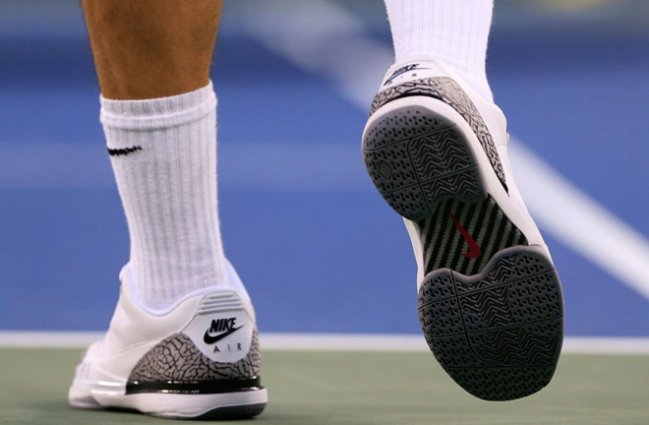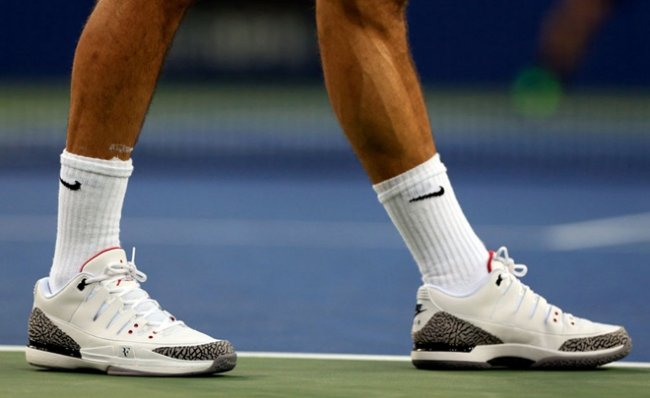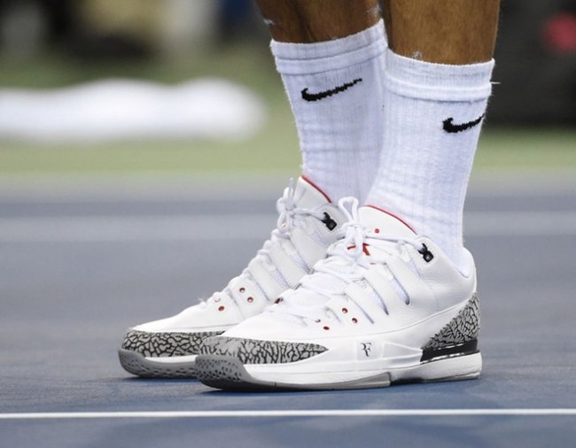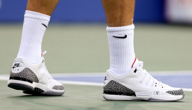 北京时间8月27日,2014年美国网球公开赛瑞士天王费德勒直落三盘击败了澳大利亚好手马托塞维奇。比赛中,费德勒亲自上脚了刚刚发售的NikeCourt Zoom Vapor AJ3,而Michael Jordan则在场边观战为费德勒助威加油,为这双跨界球鞋做足了宣传。