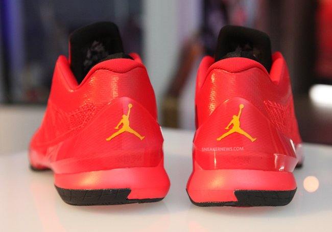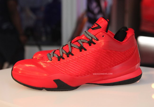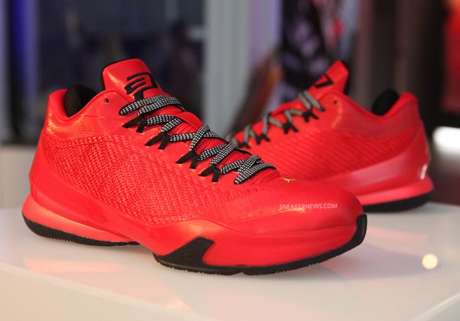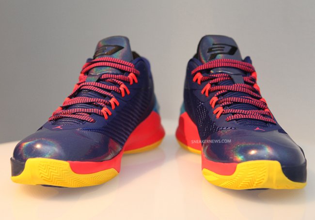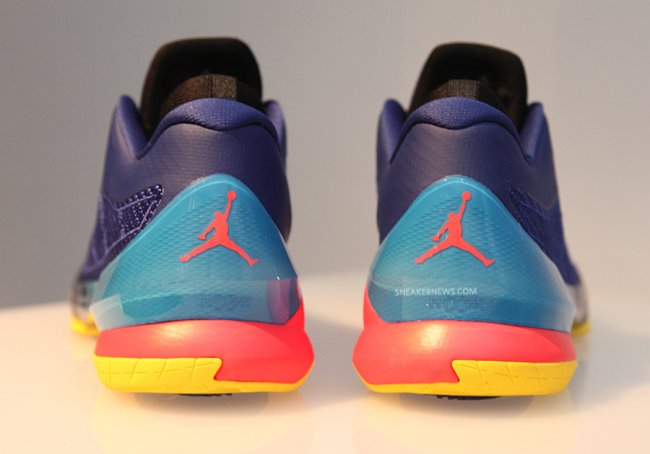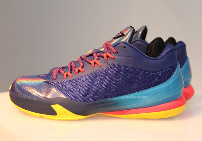 Air Jordan 2014年冬季新品发布会上我们看到了即将上市的全新Jordan CP3.VIII鞋款,眼前便是官方率先发布的两款配色,一双以紫色作为鞋身主色调搭配红、黄以及蓝色细节,鞋头部分以七彩反光漆皮装饰;一双则通体红色呈现,搭配黑色内衬、飞线以及大底,黄色点缀于Jumpman logo,白色相间装饰于鞋带。
