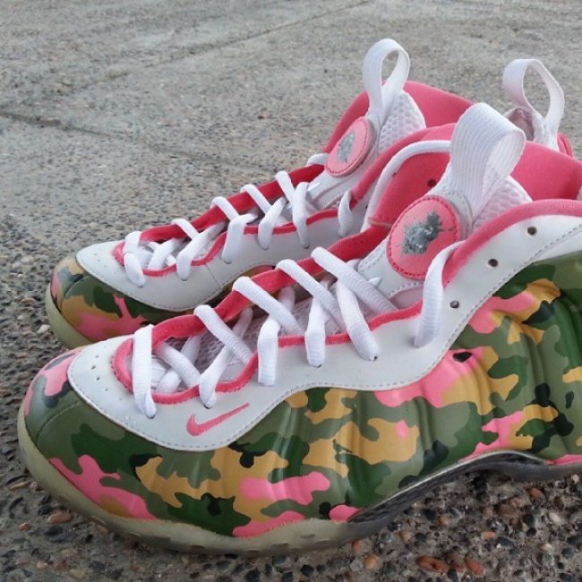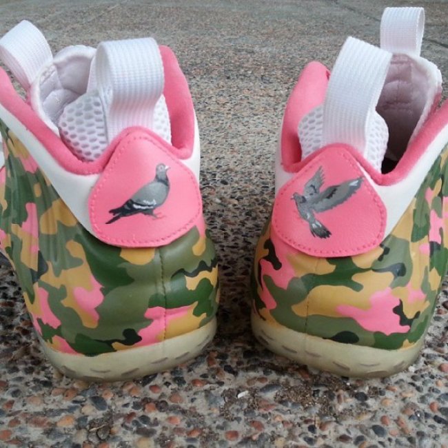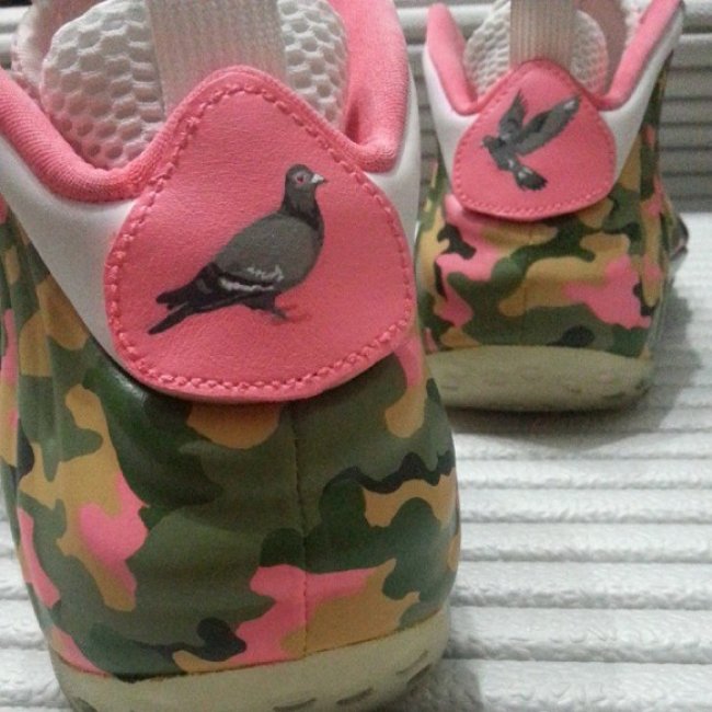 Staple Pigeon依旧是不少人喜爱的设计主题,比如Alberto Lou,近日呈现全新定制作品,选择Air Foamposite One作为定制模版,鞋面染以粉色、深浅不同色调绿色以及卡其色迷彩纹理,鞋舌以及后跟均绘有和平鸽图案。