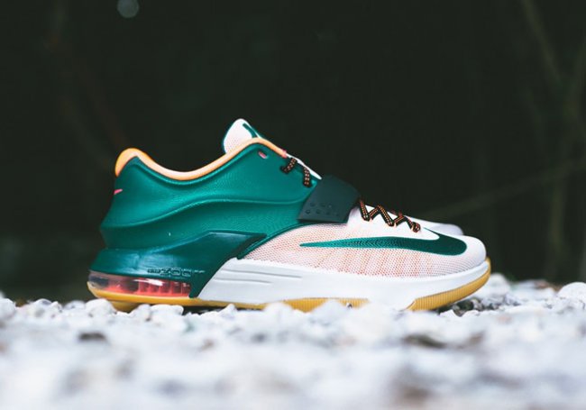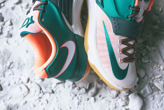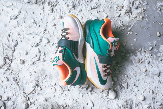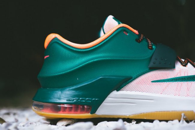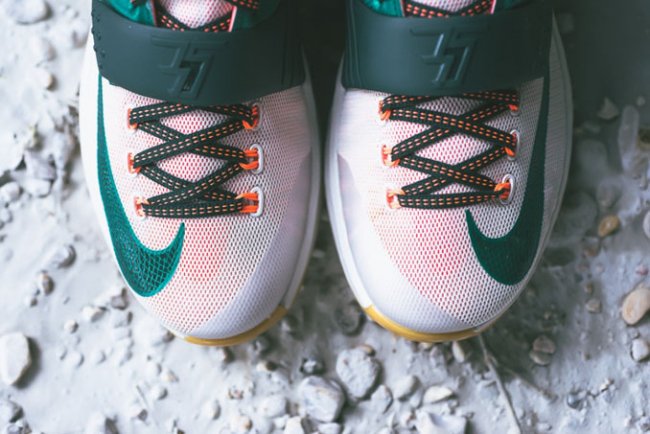 1752年6月,发明家及政治家本 富兰克林曾用一把金属钥匙和一只风筝发现了闪电的秘密,从根本上改变了人们对闪电和电流的理解。富兰克林不仅与凯文 杜兰特一样为气象着迷,他的头像还是面值100美元的纸币的主角,这款 KD7 配色采用的绿色调与图案灵感正是来自于这张 “本杰明钞票”。除了向富兰克林致敬以外,这款配色同时也呼应了杜兰特的绰号——“Easy Money”。