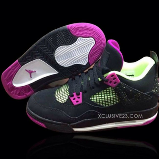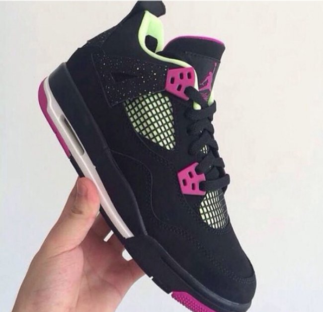 今天网络上曝光了一款之前从未露面过的 Air Jordan 4 GS 全新配色。这款 AJ4 采用黑色牛巴革面料打造鞋身主体,辅以荧光绿色的网面以及内里,鞋带扣、Jumpman Logo 等细节则以粉紫色呈现。目前暂无该款配色的市售信息,无法确定鞋款会在今年年内还是要待到明年才会发售。