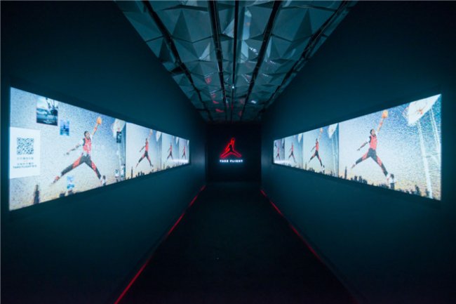 在位于上海市新乐路的 Nike Lab X158 SHA 落地橱窗后面,由线条悬挂起来的 Air Jordan XX9 字样显示了本次主题展览的主角。登上二楼,以一个发光的 Jumpman Logo 作为开端,两侧的墙面上出现了Air Jordan发展历程的各种画面。紧接着的长廊展示了拆解后的 Air Jordan 1 到 Air Jordan XX8 共二十八组 Innovation Frame,像展开的书页一样讲述着每一双 Air Jordan 引领功能性篮球鞋以及球鞋文化的历史。