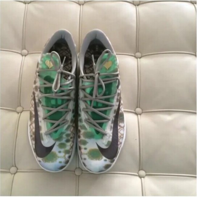 稍早前我们曾经为大家报道了一双Nike KD 6 “Wanda Pratt”鞋款,白色鞋身配合绿色润点呈现,“Wanda Pratt” 标志性的心形 Logo点缀于鞋舌,白色中底及大底搭配组合。虽然大家都清楚这双鞋并不会市售,但是我们可以从图中感觉到杜兰特对于母亲的尊敬和爱。