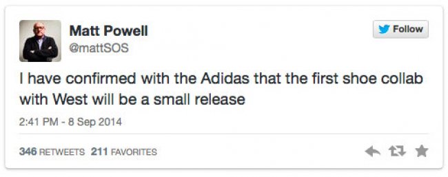 近期有关 Kanye West x adidas 系列产品的消息不断,又有球鞋市场分析师 Matt Powell 更新 Twitter,并透露已经向 adidas 方面进行确认,届时系列首轮鞋款将以限量形式登场。