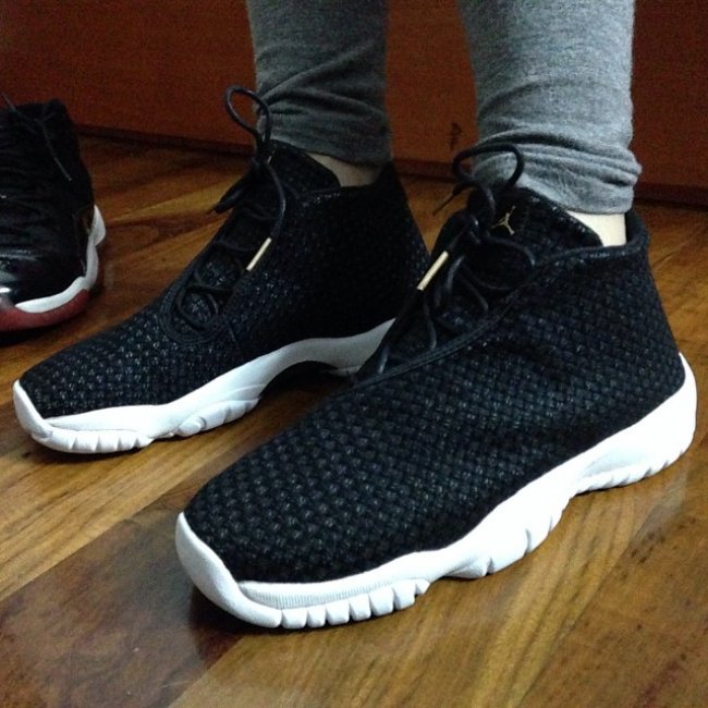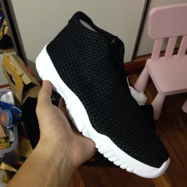 Jordan Future在推出了多双反光网面版本之后,又于近日曝光了一双黑白编织配色。黑色编织鞋面上曾差有些许白线装饰,增加整体细节。白色中底搭配白色外底,标志性的水晶底被移植到了前掌与后掌,选用纯净的蓝色呈现,鞋舌刺绣以及鞋带头装饰依旧使用金色打造,整体低调而呈质感。