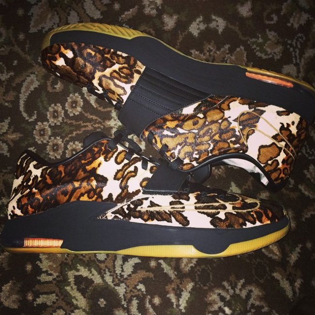 杜兰特已经确定留守 Nike ,KD7 也得以延续。日前杜兰特便亲自在网上晒出了一款全新配色的 Nike KD7 “Pony Hair”。据悉这款配色是为了纪念杜兰特获得 H-O-R-S-E 投篮赛冠军而精心打造。鞋款鞋身以十分抢眼的豹纹图案覆盖,辅以黑色魔术贴以及中底,外底则以橡胶底呈现。目前尚不清楚该款配色会不会以市售形式出现。