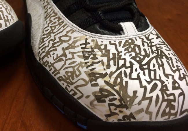 请大家务必要记住 Mark Smith 这个名字,眼前这款 Air Jordan 10 “Laser” 镭射 PE 由 Mark Smith 制作,而他作为 Nike 的艺术家/设计师/发明家,发明了在球鞋上进行镭射雕刻的技术。作为镭射球鞋之父,大家会在很多地方看到他的名字,而多半都和镭射雕刻球鞋有关。