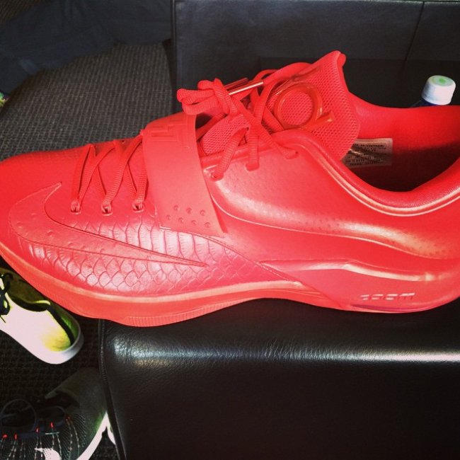 于上周末在国内正式发售的Nike KD 7 “Global Game” 因它出彩的大红配色及不俗的细节设计,令其成为了目前最受欢迎的Nike KD 7 配色。而Kevin Durant今日也在自己的社交媒体上曝光了自己的Nike KD 7 “Global Game” PE,这双专属版本的Nike KD 7 采用红色打造整体,鞋头处原本的Hyperfuse鞋面被蛇鳞皮革所取代,鞋头的Swoosh则使用红色鸵鸟皮制作,整体拥有出色的质感。