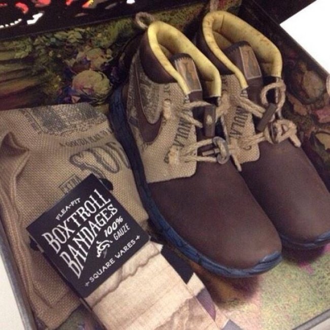 莱卡工作室打造的全新电影《The Boxtrolls》将于本周正式上映,Nike为这部电影特别设计的鞋款也日益临近正式释出。此前官方已有细节预览放送,如今网上提前曝光鞋款完整实物以及套装内容,此番选择Roshe Run Mid来巧妙呈现电影中的情节,随鞋附上一对BOXTROLL主题袜以及麻织防尘袋,所有内容都盛放于特别鞋盒中。