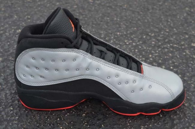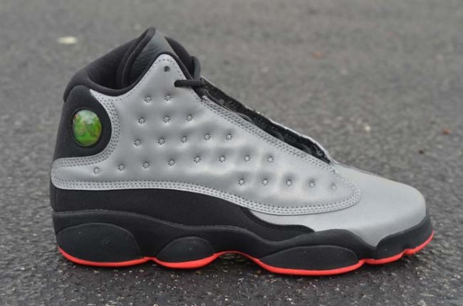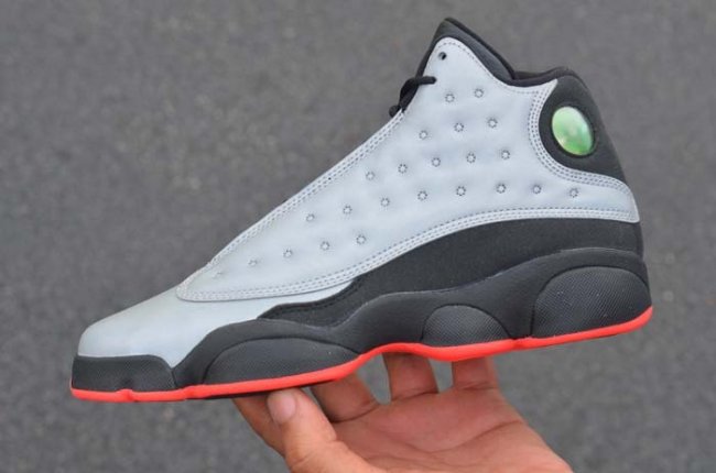 Air Jordan 13 Infrared 23 配色曝光已久,究竟这款使用3M元素与射线红元素打造的全新鞋款实物如何呢,送让一组全新实物图让我们一起来了解下吧!银灰色反光鞋面搭配黑色中底,,仅用射线红点缀在外底及鞋舌Jumpman Logo之处,整体低调而不简单,在强光的照射下鞋款可以焕发出全新的面貌。