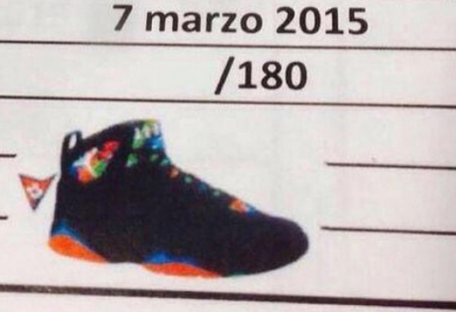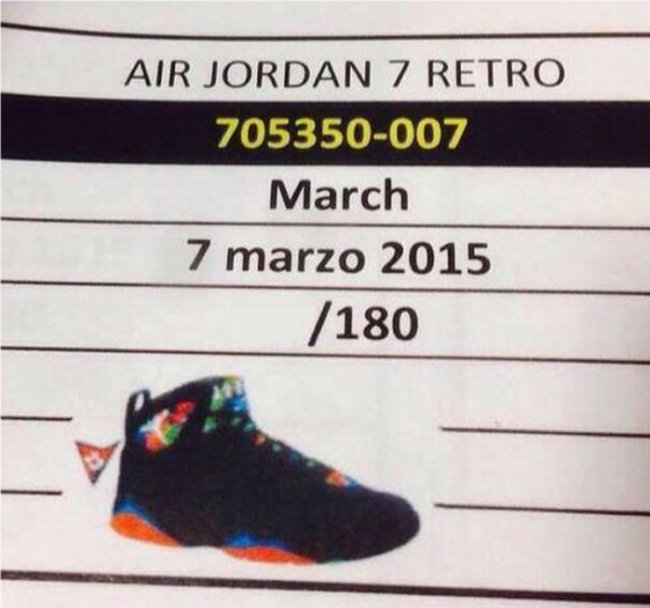 明年是 Air Jordan 7 的复刻大年,日前网上又流出了一款名为 “Marvin the Martian” 的 Air Jordan 7 谍照。这款 AJ7 以黑色为基底,辅以蓝色、橙色以及绿色的细节点缀,配色十分特别。鞋款定于明年3月7日发售,货号为705350-007,售价180美元。