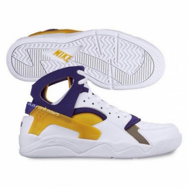 还记得Kobe没有球鞋合约的那段时期吗?记得他的脚上出现过哪些湖人色调球鞋吗?其中的一款就是白/紫/金色的Nike Huarache,而现在Nike终于决定正式推出湖人配色Air Flight Huarache。网络提前曝光实物照,暂无具体市售信息披露。