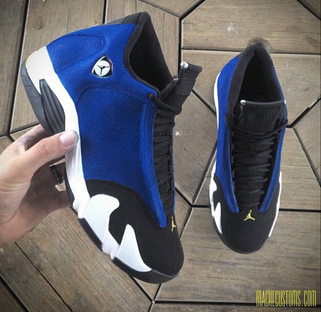 Air Jordan 14 兰尼?是的你没有看错,不过这双蓝白黑兰尼色调的Air Jordan 14 并不是官方推出的版本,而是由美国知名球鞋定制师Mache打造而成。蓝色麂皮鞋身搭配黑色鞋头及白色中底,兰尼色调标志性的黄色巧妙的运用在鞋身Jumpman Logo之上。PS:大师就是大师,Mache的创意和手艺还是那么棒。