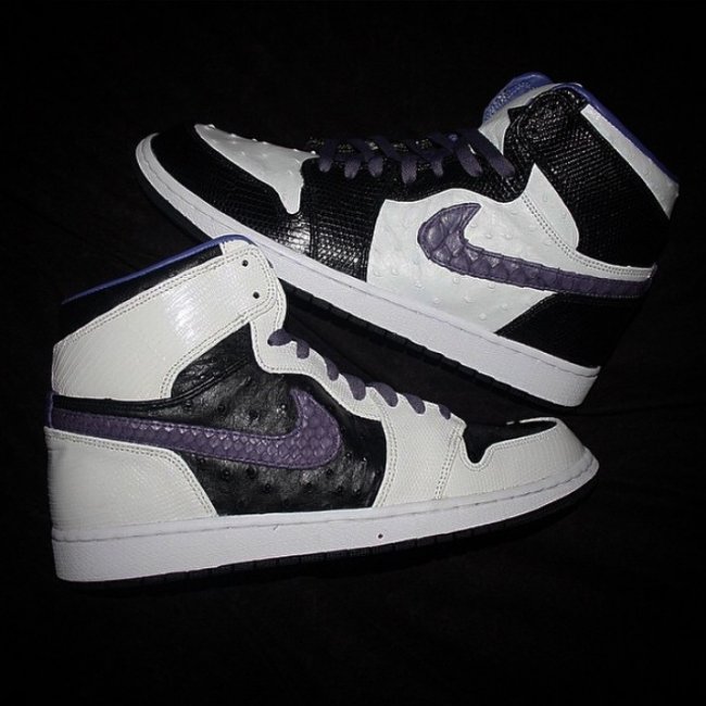 JBF Customs 再次带来全新 Air Jordan 1 定制作品。鞋身选用黑色搭配白色,辅以紫色 swoosh 以及内衬装饰,材质方面选用蛇纹皮质、鸵鸟皮以及蜥蜴纹理皮革进行混搭,左右脚鞋面色调相反呈现,颇为特别。