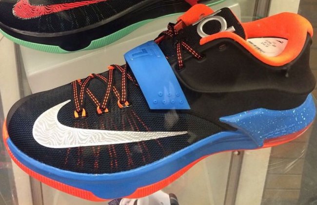 2014-15NBA常规赛将于10月28日正式打响,而Nike为杜兰特准备的全新雷霆客场配色的Nike KD 7 也将于10月31日正式发售。这款Nike KD 7 继承了之前KD 系列的风格,黑色主色调鞋身搭配橙色与蓝色细节,完美的呈现了雷霆队的主题配色。