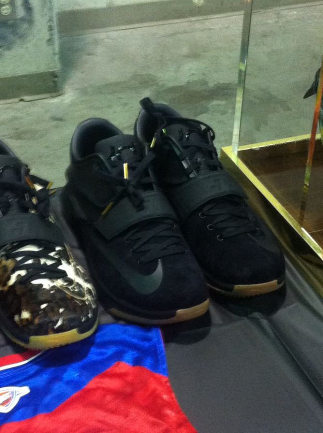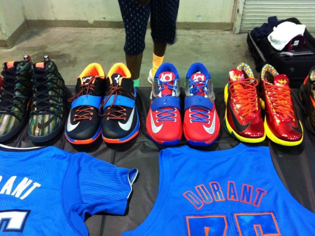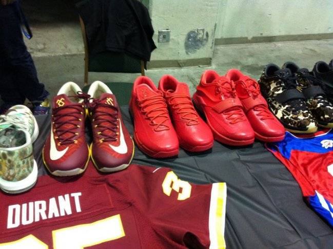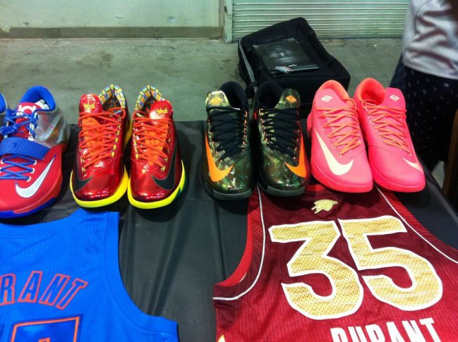 周六俄克拉何马城的OKSoles球鞋活动上,Kevin Durant的好朋友Randy Williams展示了数款以往曾经曝光以及从未曝光过的Nike KD系列罕有鞋款,其中不乏Velvet Hoop、Wanda Pratt、MVP别注KD 6,马毛、红色蛇纹、PG County、金牌别注KD 7等令人垂涎的非市售鞋款。