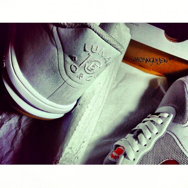 联名大戏继续上演,网上提前披露CLOT联手Nike打造的十周年Lunar Force 1局部谍照。鞋身灰色Hyperfuse搭配红色swoosh,后跟附有10周年特别logo突出主题,配以白色Lunarlon中底以及生胶大底。暂无此款的详细市售信息。