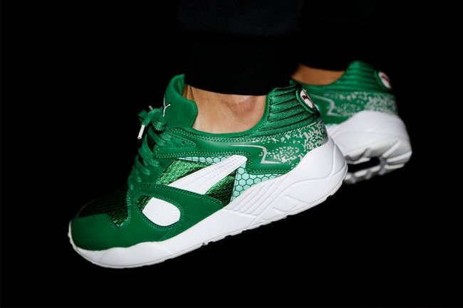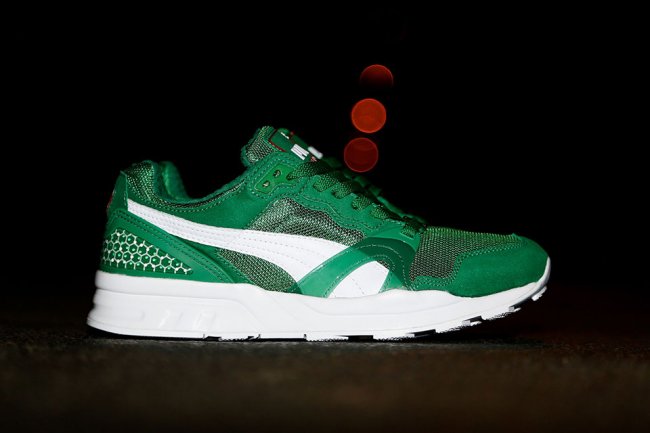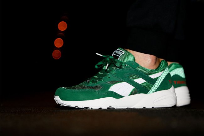 在很多sneaker heads脑中PUMA的红色纸盒和红色clever little bag都是十分经典的,但在上世纪90年代初,PUMA的鞋盒是绿色的。去年PUMA复刻Trinomic xt2 plus后,也将这款经典的鞋盒复刻。今季PUMA就以这款鞋盒为灵感,设计Blaze of Glory、R698、Trinomic XT2,全绿配色十分养眼。