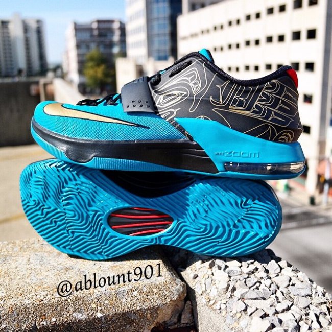 Nike N7 配色本季依旧出现在了全新的 KD7 之上,继上周首次曝光谍照之后,此番鞋款的上脚图片也在网络上流出。延续了 N7 配色黑蓝色的一贯主题,此外还配以金色 Swoosh 以及印花图纹装点。据悉鞋款暂定于11月份发售,具体日期还有待确定。