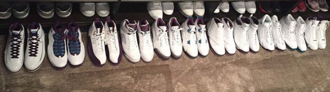 黄蜂队老板迈克尔-乔丹在昨天亲自接管了球队的官方社交账号(不过时间只有一天),在这一天中,乔老板分享了不少自己与球队的点点滴滴。而作为鞋迷朋友的我们,自然会被其中的一张照片所吸引,照片中,乔丹曝光了一系列黄蜂队配色的 Air Jordan 正代鞋款。其中包含了 AJ3、AJ4、AJ5、AJ7、AJ10、AJ11、AJ12、AJ13、AJ16 等,实在是令人羡慕到发狂。看来下赛季黄蜂队的球员脚下,相当具有看点!