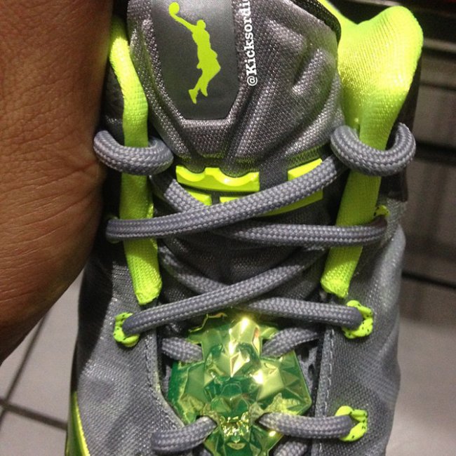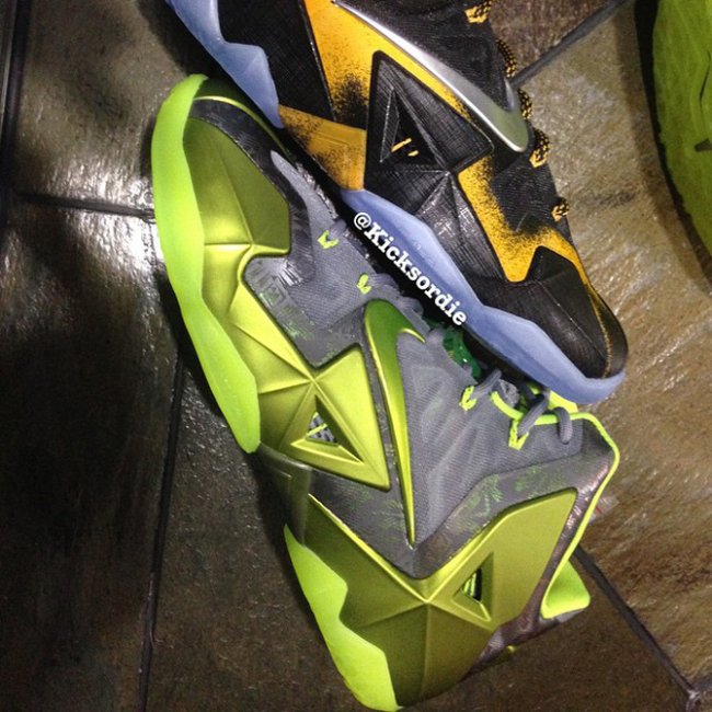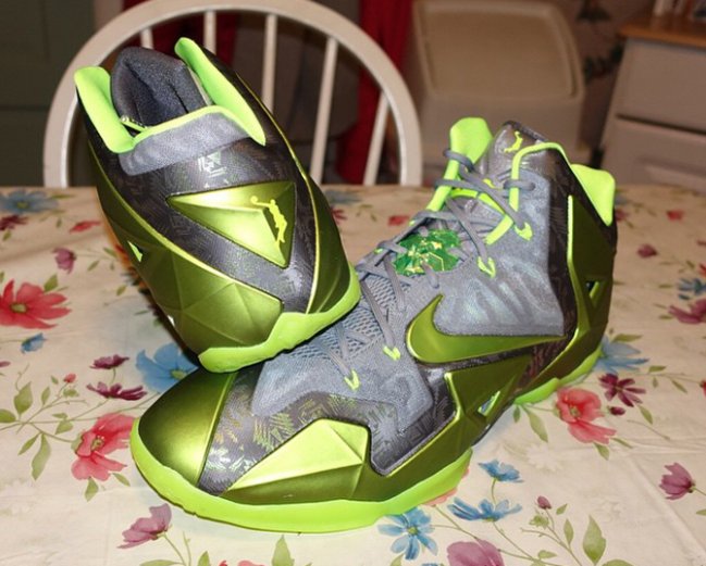 网上再度曝光LeBron 11 Dunkman别注备选样品的实物照,灰色Hyperfuse搭配金属绿色Hyperposite,衔接部分印有特别图腾装饰,鞋舌以及后跟均有Dunkman logo突出别注主题。