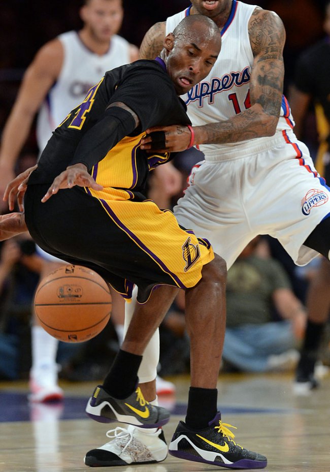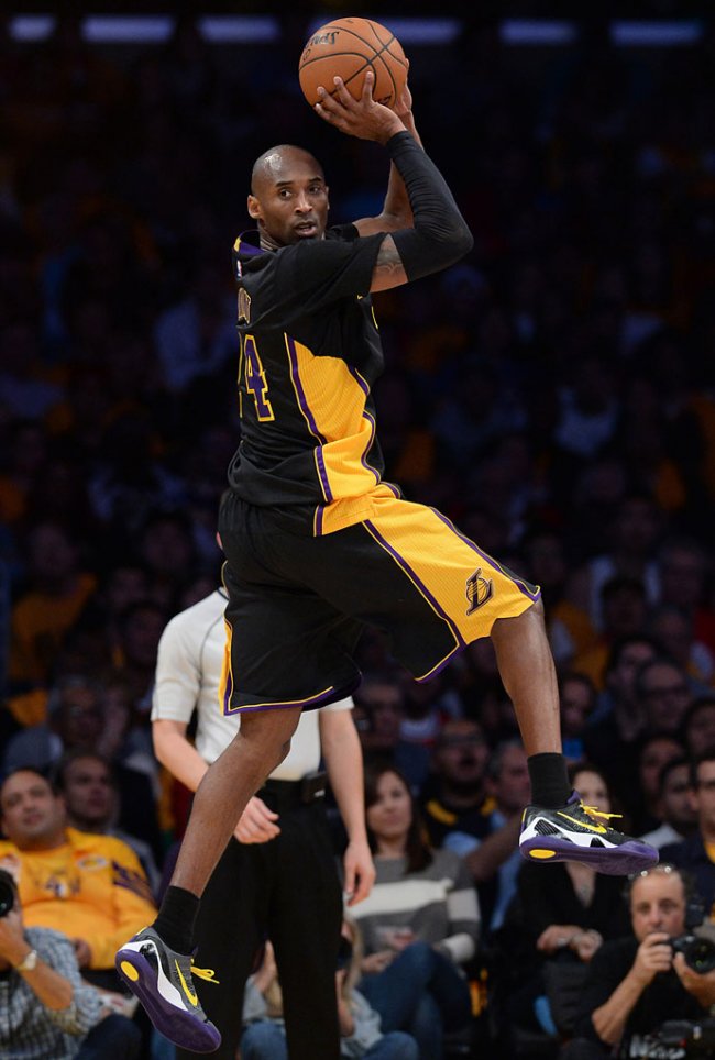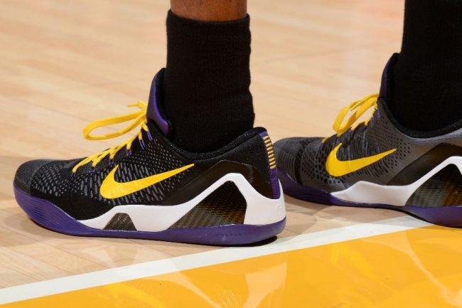 昨天湖人队换上“好莱坞之夜”特别球衣对阵同城球队快船,Kobe Bryant则换上了与球衣颇为搭配的“好莱坞之夜”配色Nike Kobe 9 Elite Low PE。鞋款鞋身以黑色以及灰色作为主色调,配上紫色鞋舌/后跟/大底、白色中底以及黄色鞋带/swoosh。