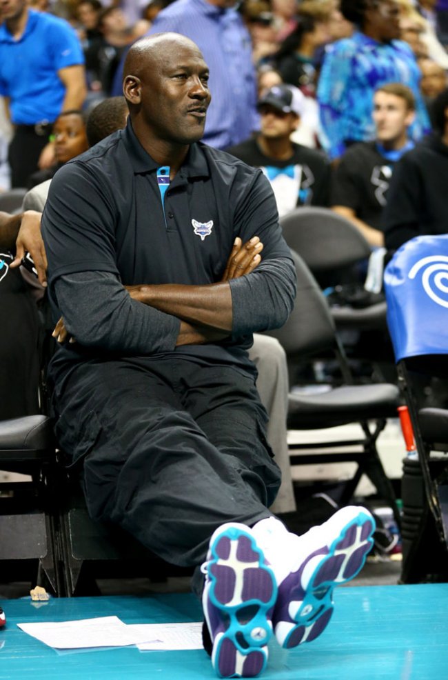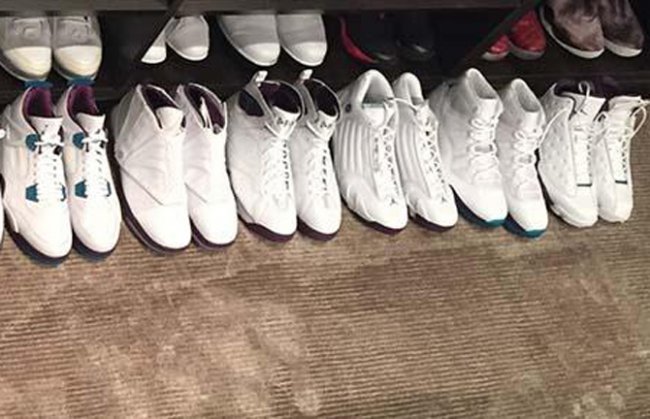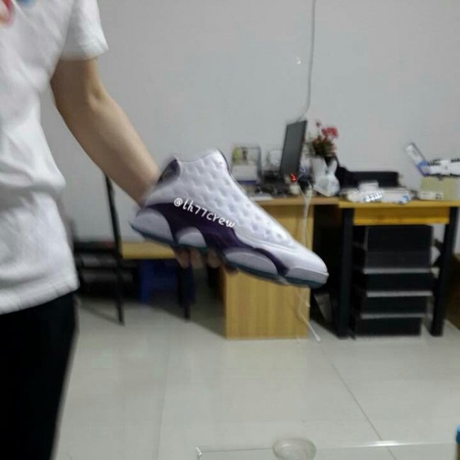 Michael Jordan在夏洛特黄蜂队揭幕战当天亲着的Air Jordan 13 “Hornets” PE 因为其美如画的配色和极其罕见的意义备受鞋迷的关注。而近日网络上也出现了这双Air Jordan 13 “Hornets” PE的全新谍照,虽然有点模糊但我们还是可以清楚的看到鞋款采用夏洛特黄蜂标志性的白色与蓝紫色调呈现,白色鞋身搭配紫色中底与绿色外底。