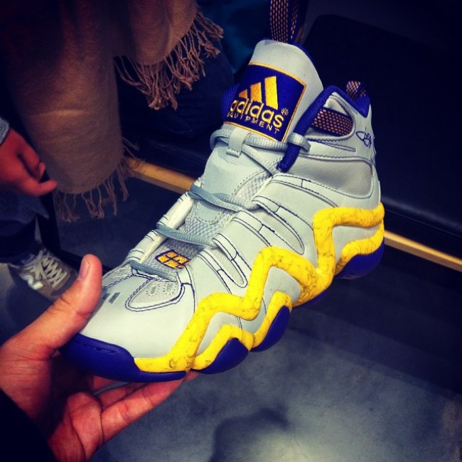 之前曾有一款林书豪别注adidas Crazy 8曝光,只是配色主题仍旧是林书豪转会前的火箭队。而近日网上又曝光一款为林书豪打造的adidas Crazy 8,终于以湖人色调呈现,灰色鞋身辅以黄色以及紫色装饰。暂无此款市售信息。