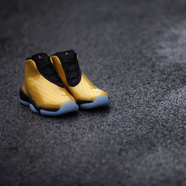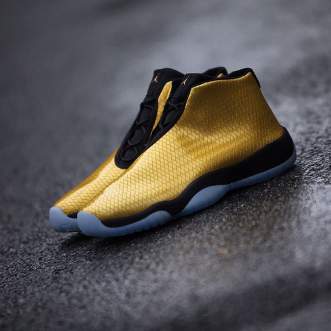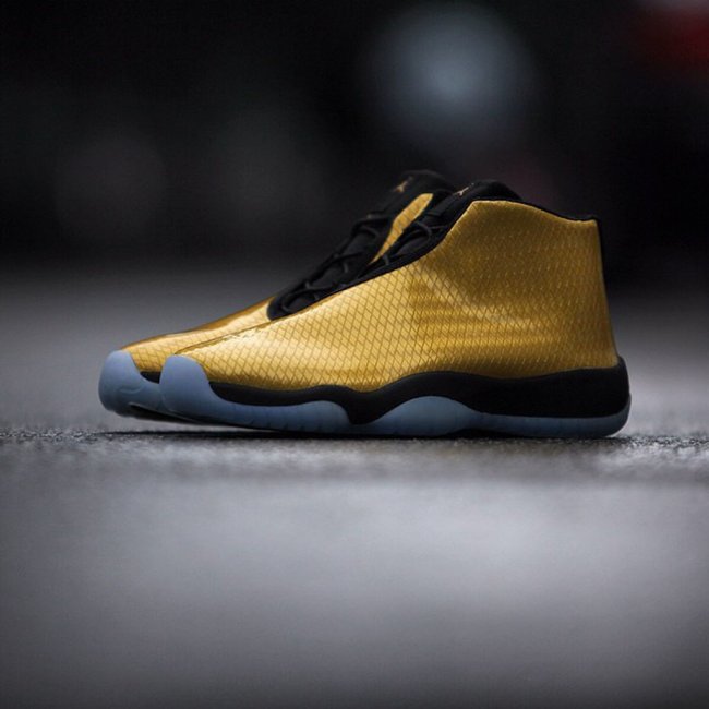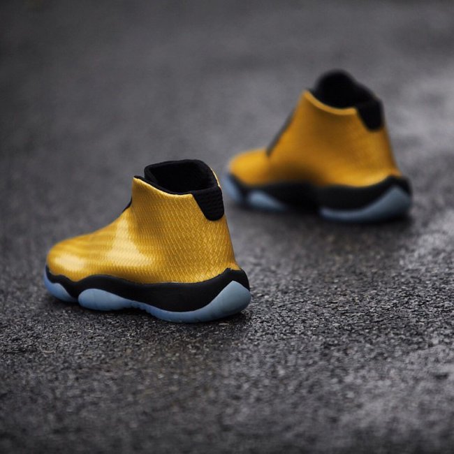 Jordan Future将推全新配色,不过此番新版本为GS尺码专属。鞋身选用特别的漆皮材质制作,底层金色编织附以表层透明漆皮,配上黑色内衬、鞋舌、鞋带、中底以及冰蓝色大底,鞋款整体风格如同金色锦鲤一般。此款即将发售。