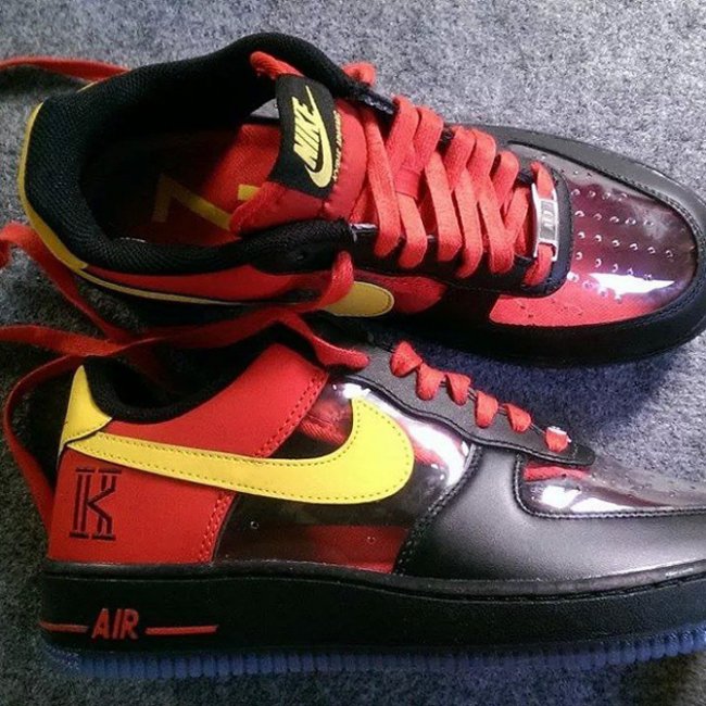 透明材质回归,继NIKEiD限定透明材质终结后再度上身Air Force 1 鞋款,此番是为Kyrie Irving而打造。鞋身黑、红、黄三色调呈现骑士主题,鞋舌、鞋侧、后跟以及鞋垫均有Irving元素体现。此款货号687843-001,11月15日正式发售。