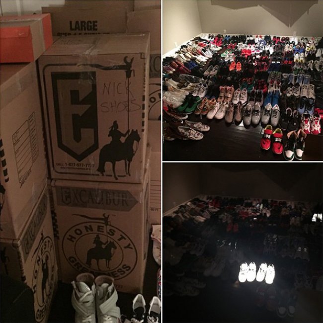 湖人球员尼克 杨对球鞋的热衷众所周知,前不久小编也为各位带来了尼克 杨位于洛杉矶家中的球鞋收藏,然而日前,生性高调的“单打王”在 Instagram 上晒出了一张照片,据他本人描述,图中是尼克 杨整理屋子时收拾出并要扔掉的鞋子,并补充道:“未来三天我要把一个装满鞋大箱子扔到街上去,谁会是那个幸运儿呢?”有多少粉丝想组团飞美帝去捡鞋呢?