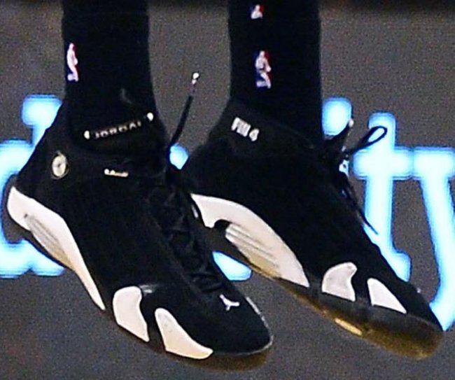 一位令人意想不到的Sneakerhead球员,PJ Tucker在对阵国王的比赛中穿上了Michael Finley的Air Jordan 14 PE。此双PE是2005年时为还在马刺效力的Finley特别打造,黑色鞋身搭配白色细节,鞋领还附有“FIN4”刺绣。