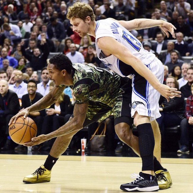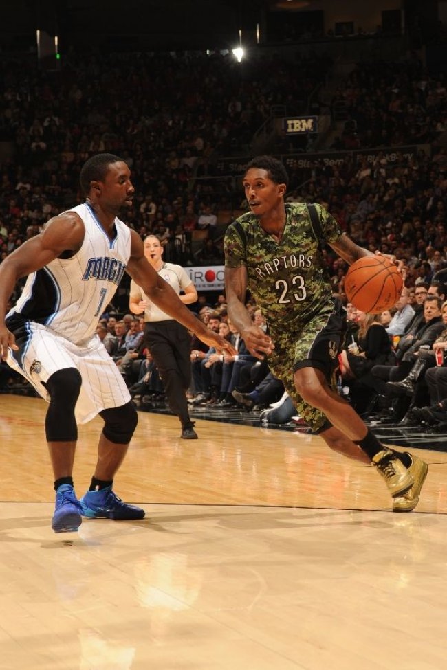 为庆祝一年一度的老兵节,多伦多猛龙队在今天对阵魔术队的比赛中穿上了短袖迷彩队服。本赛季刚刚加盟猛龙队的Louis Williams在比赛中穿着一双之前曾由Drake亲着曝光的Air Jordan 3 OVO登场,耀眼的金色鞋款加持让他很快成为了场上的焦点。