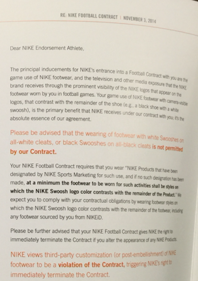 如今越来越多的球员(尤其是NFL球员)愿意穿着由球鞋定制爱好者绘画设计的球鞋亮相赛场,对于这样的发展趋势,Nike终于给出了回应。从Nike分发给签约球员的小册内容来看,Nike对于球员着用覆盖品牌logo的定制球鞋的做法表示不满,如此可以被视为违反合约的行为也可能导致品牌方解约。 虽然如此,这并不意味着Nike不认同球鞋定制的存在。曾接受Nike委任工作的知名球鞋定制者Mache表示,“Nike更多的注重点是品牌标识被覆盖,这种忧虑并非没有道理”。换言之,定制球鞋覆盖品牌标识的做法降低了品牌在赛场上的可见度以及上镜率,将其视为违约合乎情理。