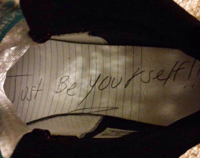 鞋舌 Logo 表明了它的身份,黑白泼墨的鞋面点缀反光 Swoosh 大钩,整体效果十分抢眼。鞋垫上的 "Just Be Yourself" 字样也增添了不少亮点。