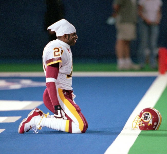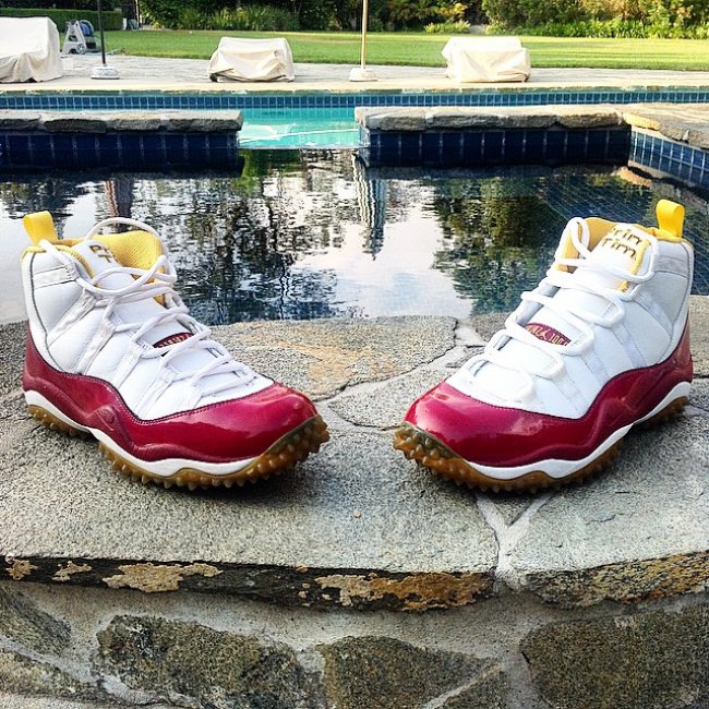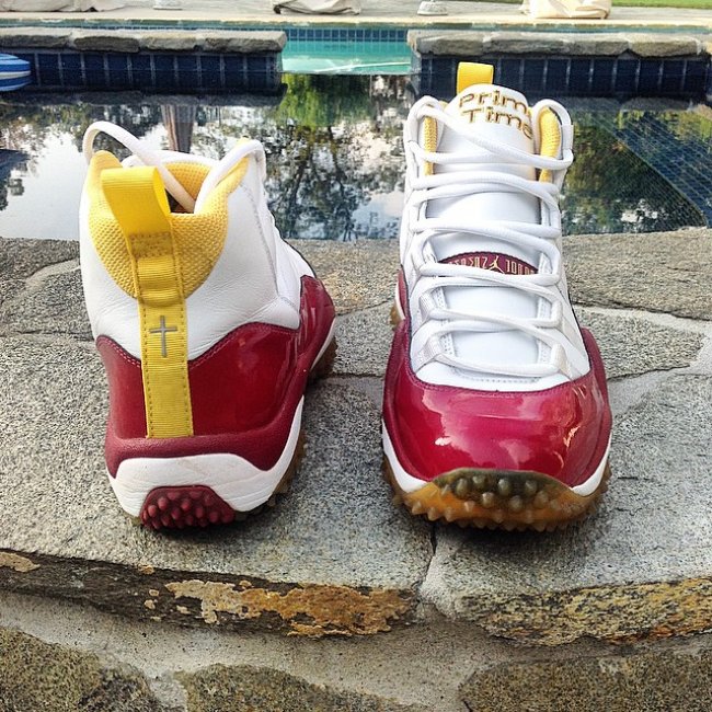 眼前这双中底部分略为特别的Air Jordan 11橄榄球鞋PE是Jordan Brand于2000年为效力华盛顿的Deion Sanders而专门打造,白色鞋身搭配红色漆皮,配以黄色内衬以及生胶大底,鞋舌附有PRIME TIME刺绣。