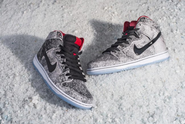 斑驳的盐斑呈现于鞋面,此款 Nike Dunk High SB 由 An thony Hart 携手 Nike SB 联合打造。红色内衬、黑色 Swoosh,映衬颇具质感的鞋面,搭配白色中底和水晶大底,冬季中的温暖感受跃然眼前。