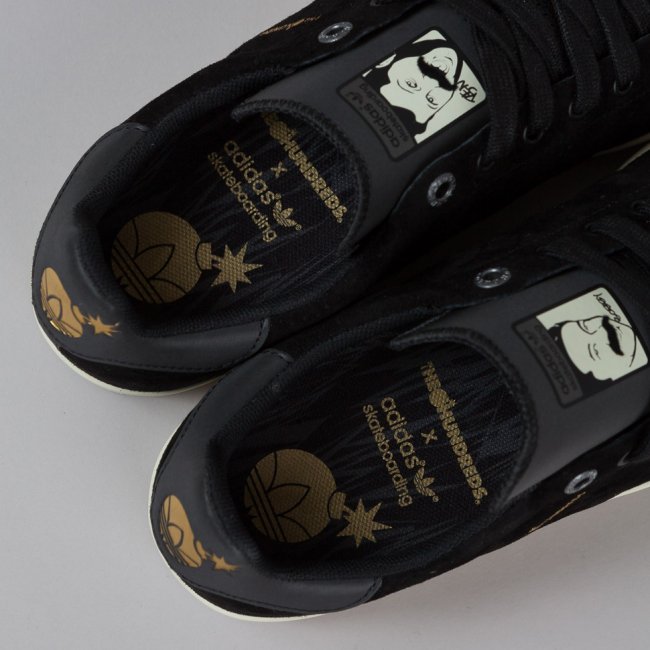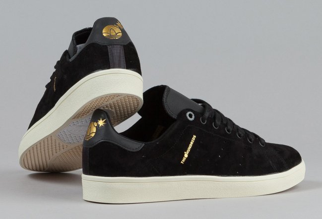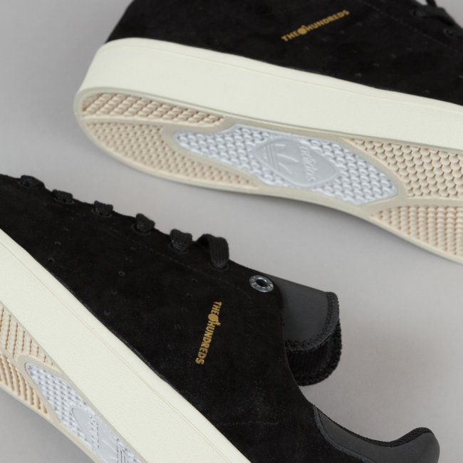 adidas Skateboarding 携手美国街头品牌 The Hundreds 联合打造了 The Hundreds x adidas Stan Smith Vulc 联名鞋款。采用黑色麂皮鞋面,The Hundreds 的烫金 Logo 十分抢眼。Stan Smith 的人物头像鞋舌也为整体鞋款增添了不少趣味性。